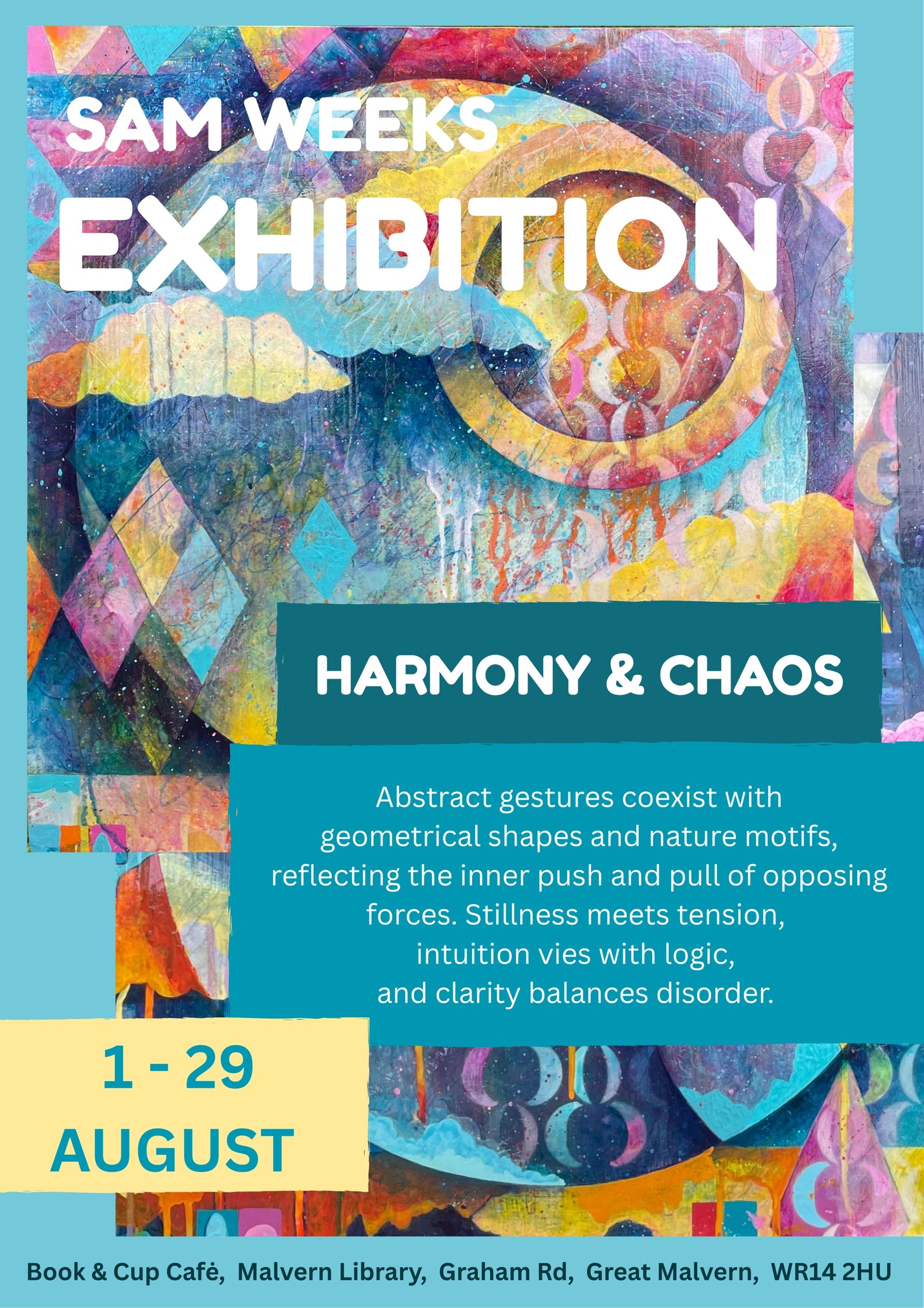 Sam Weeks’ new exhibition ‘Harmony & Chaos’, runs from 1st to 29th August at Book & Cup Café, Malvern Library. Showcasing a powerful collection of her work from the past two years. Expect vibrant colour, abstract gestures, geometrical shapes and nature motifs, reflecting the push and pull of life's opposing forces.